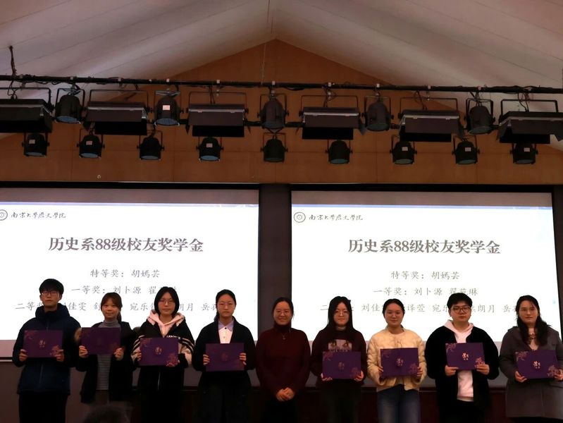 胡嫣芸、刘卜源、翟苑林、刘佳雯、舒译萱、宛乐锦、熊朗月、岳孙可8名同学荣获本年度历史系88级校友奖学金。历史系88级校友奖学金宗旨为鼓励在校学生们勤奋学习、刻苦钻研、全面发展。小妲己直播 党委书记刘颖老师为获奖同学颁发证书。