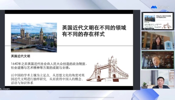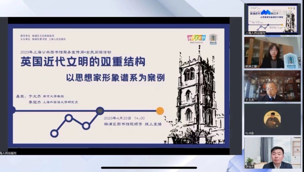在2023年4月23日世界第26个读书节到来之际,我校于文杰教授应上海市杨浦区图书馆和上海人民出版社的邀请,举办了一场题为“英国近代文明的双重结构”的学术讲座。来自上海及海内外读者570余人聆听了讲座。上海外国语大学英国研究中心李冠杰研究员主持了学术演讲并就相关问题展开对话。