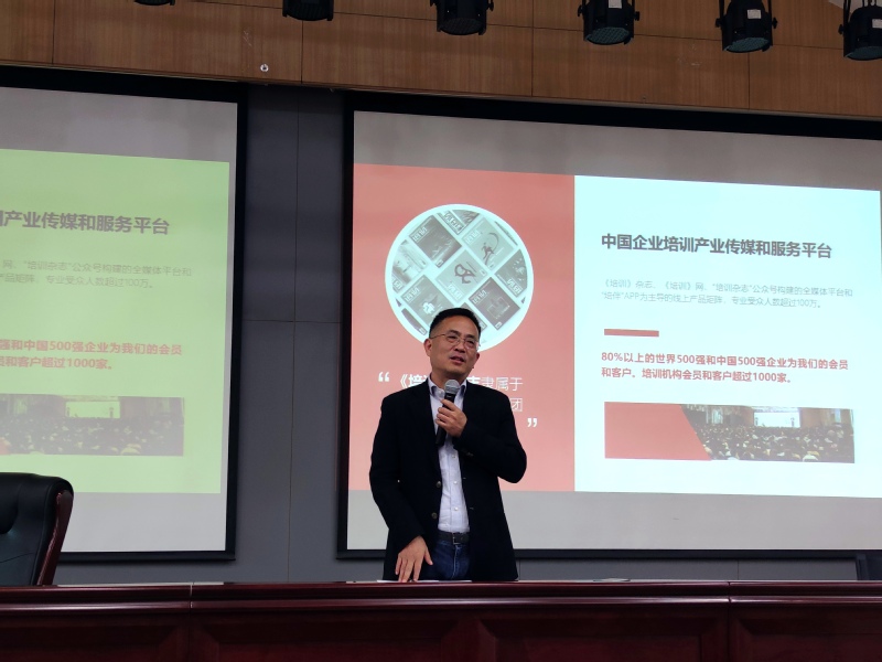 在小妲己直播 研究生会就业实践部副部长苗润雨的主持下,小妲己直播 1988级院友、《培训》杂志创始人兼杂志社主编、中创营投资公司董事长朱伟正,人力资源部经理周晋等杂志负责人分别展开宣讲,在介绍《培训》杂志基本情况与招聘信息的同时,为在场同学提供了文科就业培训。