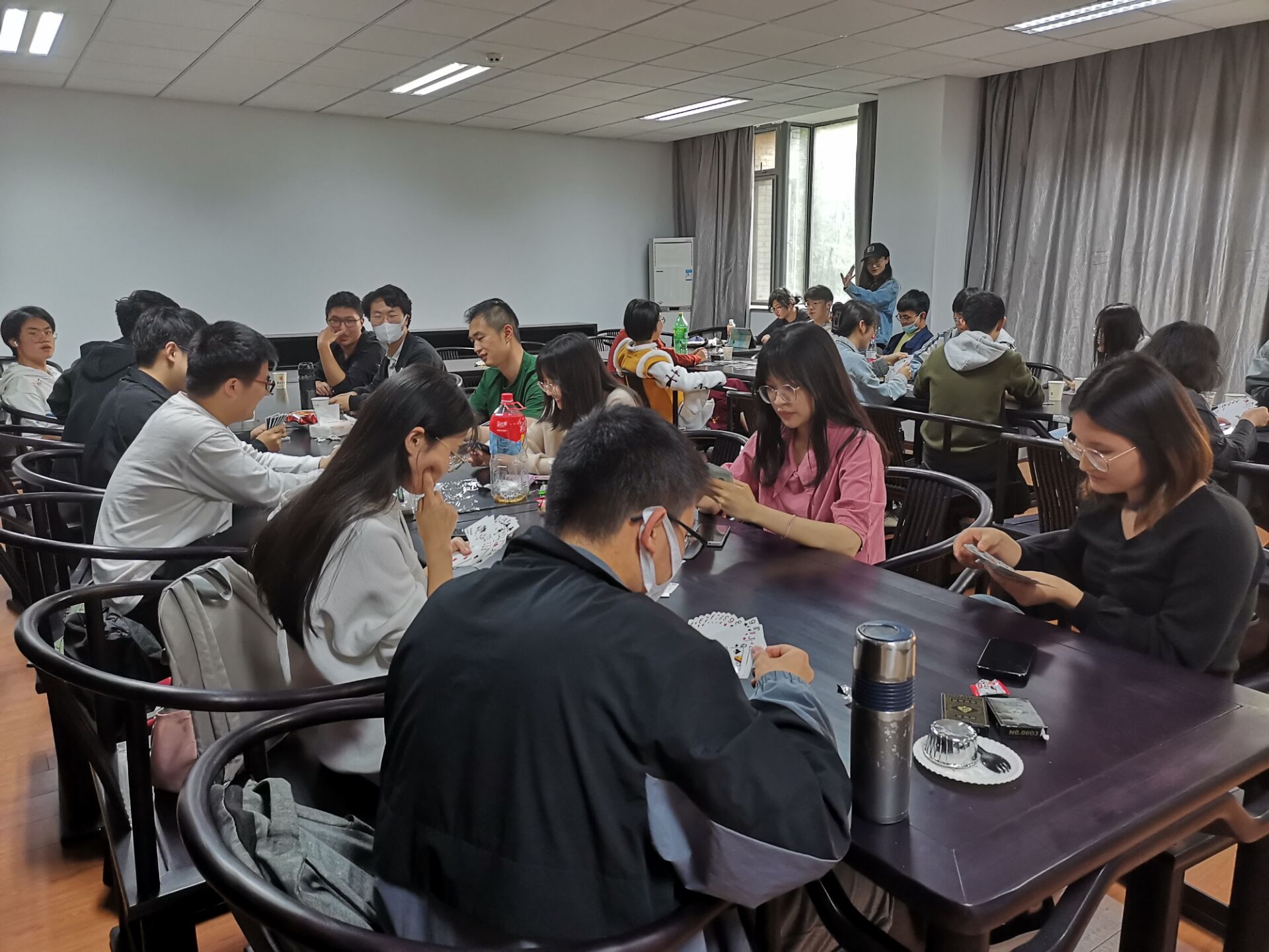 晚上的UNO桌游活动依旧激动人心,六组选手同时比拼,初赛三轮中的每一组第一晋级决赛。“UNO”的呼喊混合着“浅摸X张”的嬉笑,活动室里一派欢乐的气氛。相互“坑害”之下,原本陌生的同学迅速熟络,友谊在你来我往的“加牌”间不断升温。在欢声笑语中,一天的联谊活动也悄然落下帷幕。