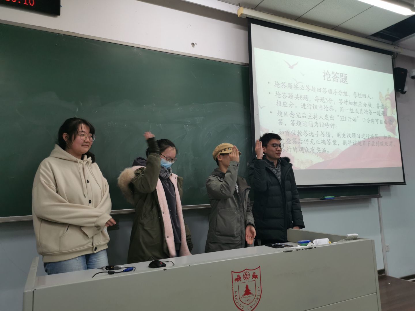 12月4日晚,竞赛开始,主持人介绍比赛流程以及比赛规则,本次知识竞赛以“新四史”知识普及为核心。比赛分为个人必答题、抢答题,为提高现场同学参与度,竞赛还设置了现场互动题。