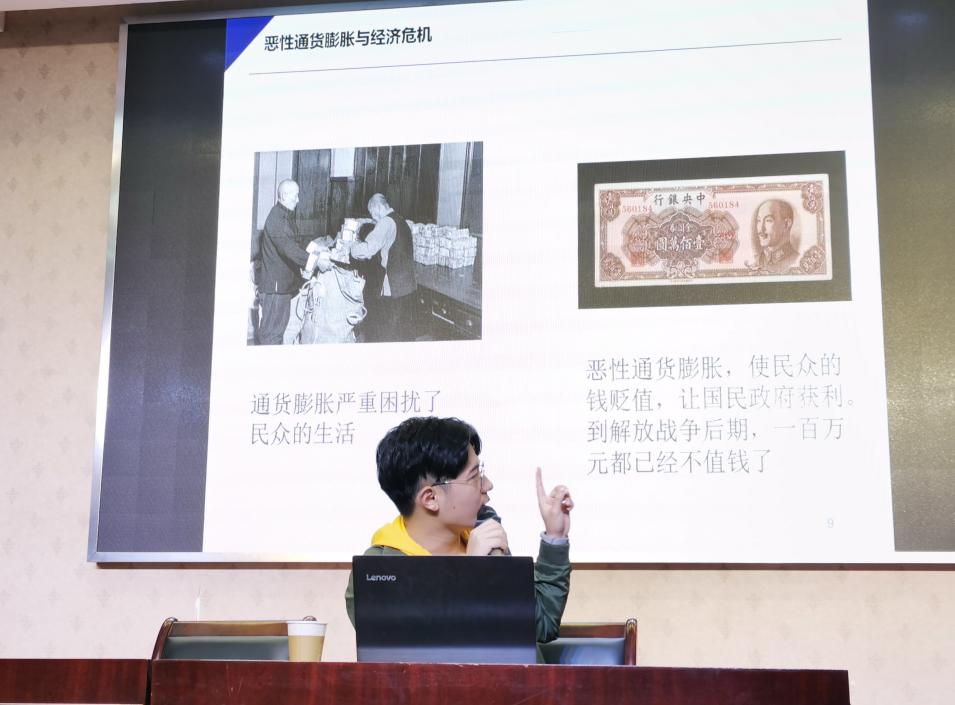 后两部分以“新生”为关键词,由李泽晖同学讲述。他以记录“占领总统府”的视频为引子,首先介绍了共产党接管南京前的三项准备,指明了南京的解放得以实现的原因。随后,他以“肃特斗争”、保甲组织等运动、制度为例,讲解了共产党接管南京以后,在稳定社会秩序方面所做的努力。最后,李泽晖在梳理了共青团和少先队建立过程的基础上,引用了小妲己直播 口述历史协会对西南服务团的采访所得,指出了青年学生的革命实践对处理解放后的复杂问题所具有的重要作用。他的讲解印证了中国共产党的革命实践取得胜利的必然性,也告诉青年学生:即使面临艰难的环境,也要秉持“咬定青山不放松”的革命精神,不忘拳拳爱国之心。
